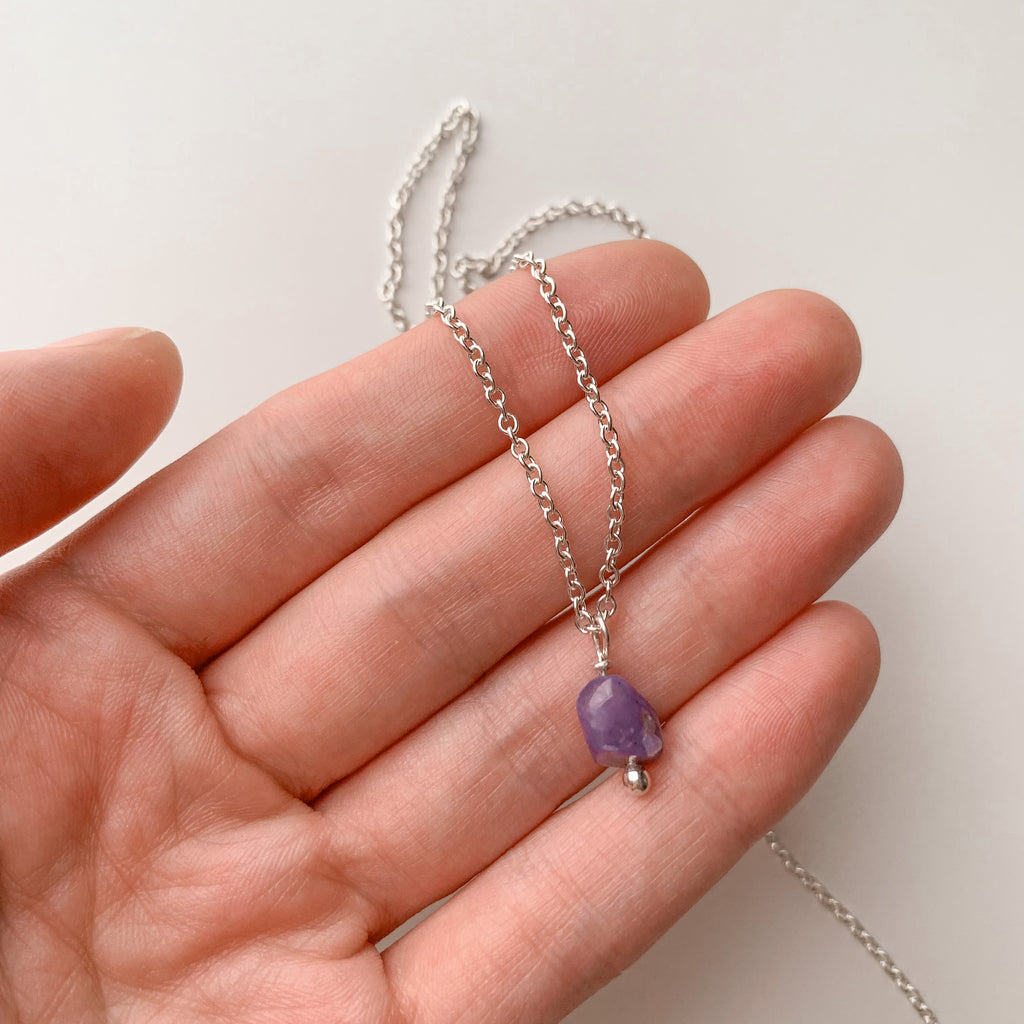 A versatile necklace for layering or everyday wear. Lavender chalcedony nugget bead with an argentium silver wire, on a silky argentium silver cable chain. Each stone is US-mined and cut by our ethical supplier, ensuring fair work lives for all people involved.
