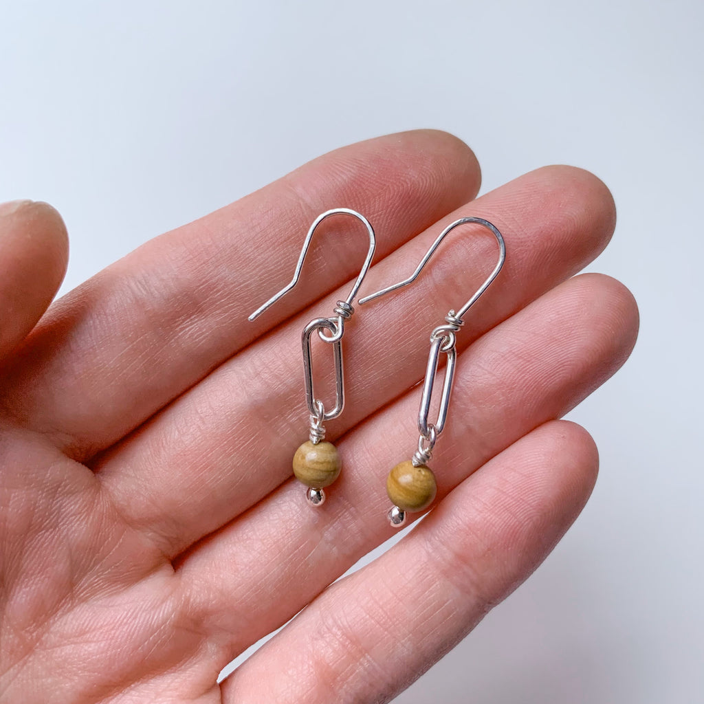 A pair of short earrings with bold oval drops and natural stone beads. Each stone is US-mined and cut by our ethical supplier, ensuring fair work lives for all people involved.