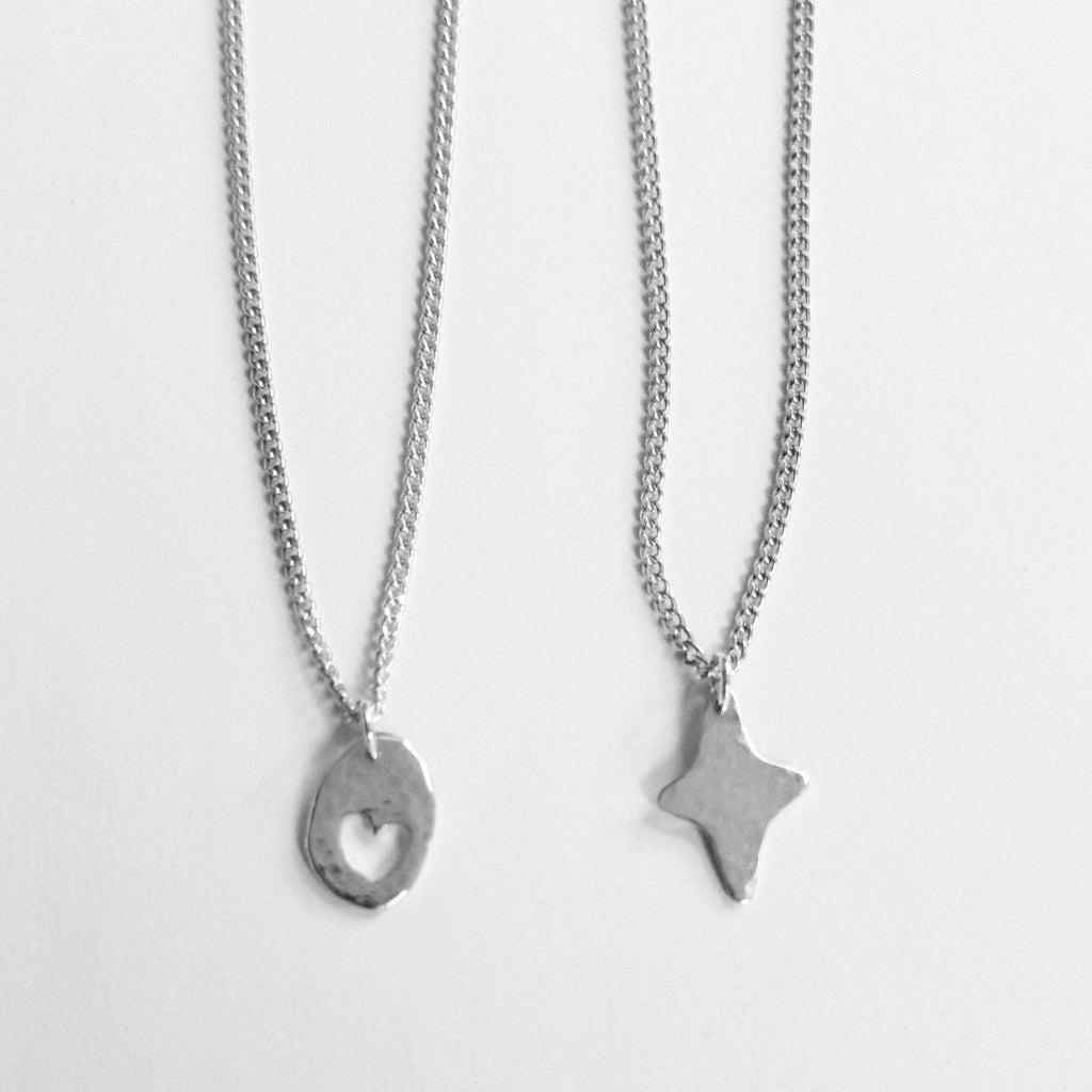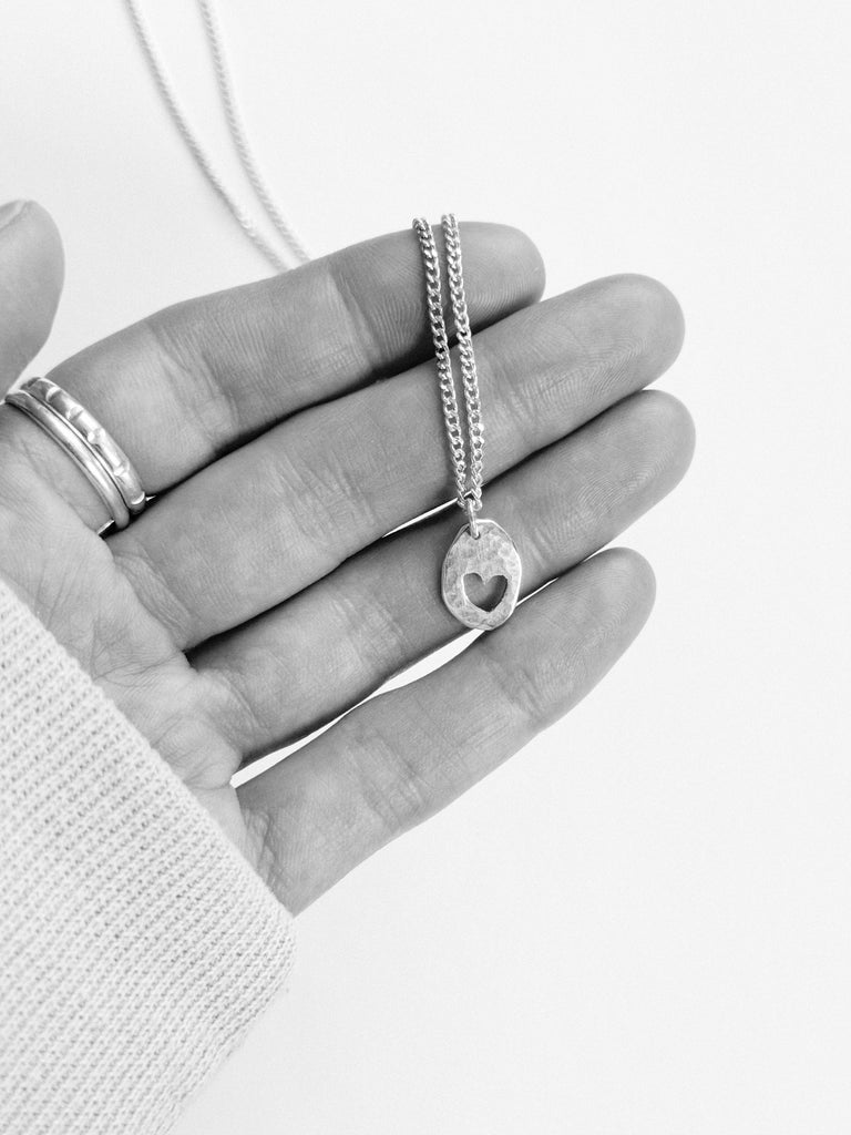 A silver layering necklace with a small, imperfect open heart charm. The charm hangs from a jump ring on a silky mini curb chain. Charms are hammered on one side and simply polished on the other.