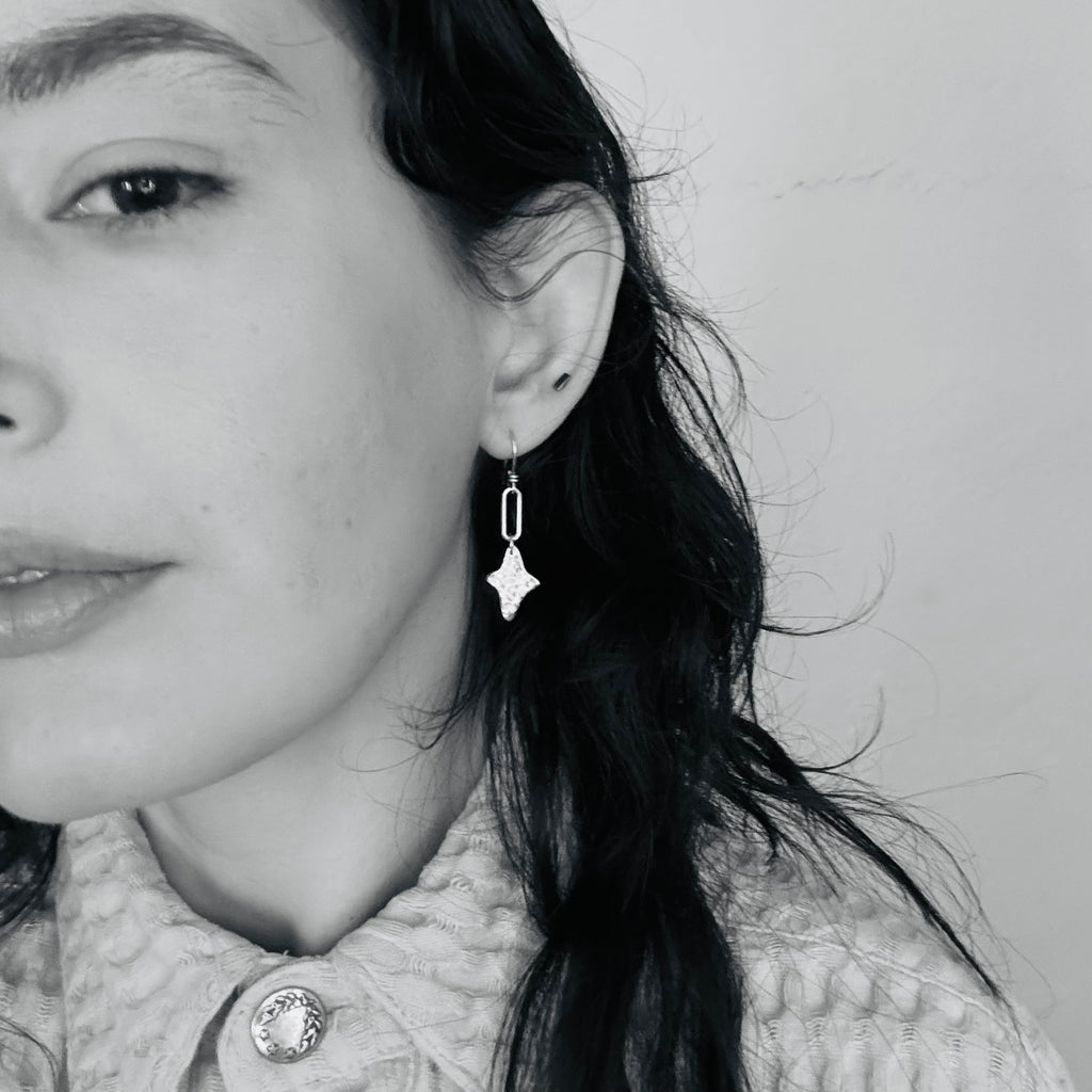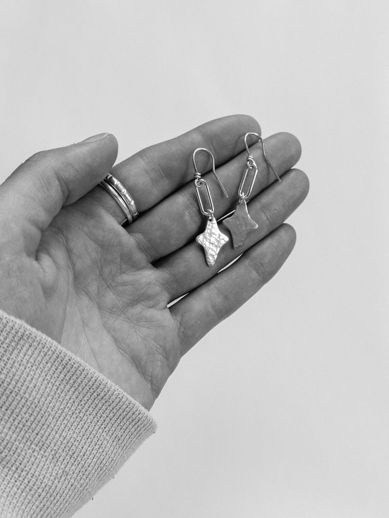 Short drop earrings featuring imperfect starburst charms. Charms are hammered on one side and simply polished on the other.