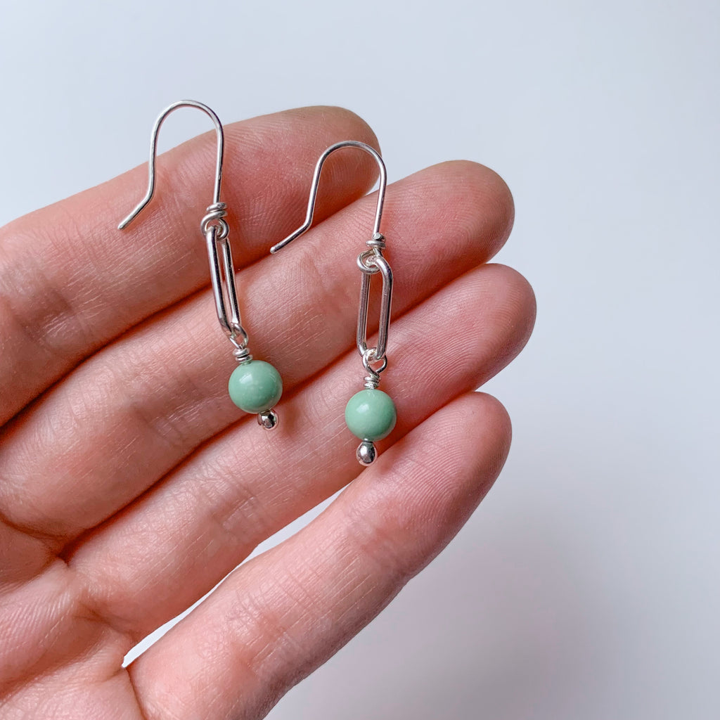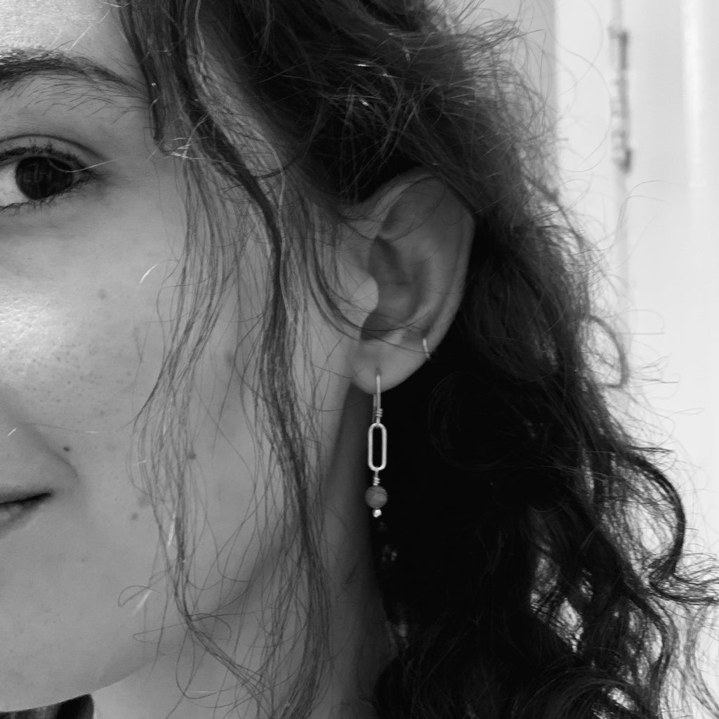 A pair of short earrings with bold oval drops and natural stone beads. Each stone is US-mined and cut by our ethical supplier, ensuring fair work lives for all people involved.