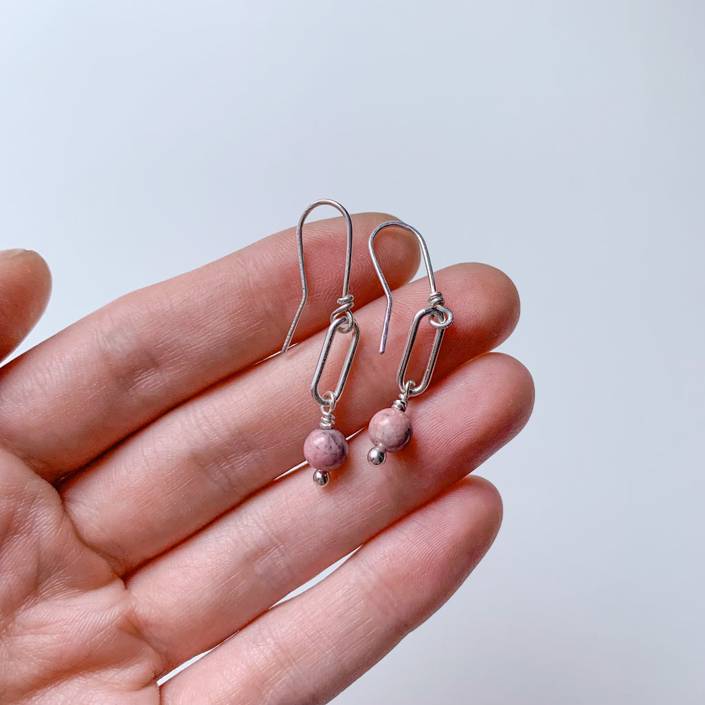 A pair of short earrings with bold oval drops and natural stone beads. Each stone is US-mined and cut by our ethical supplier, ensuring fair work lives for all people involved.