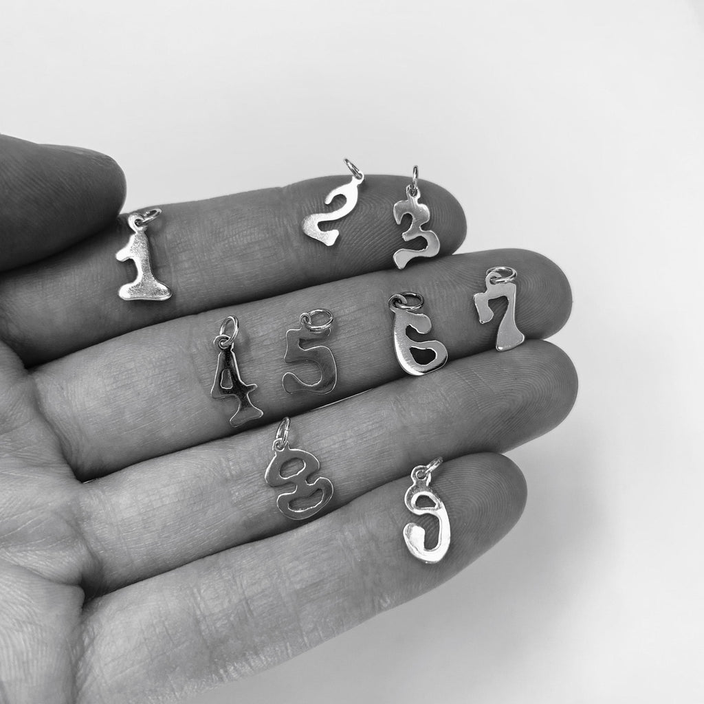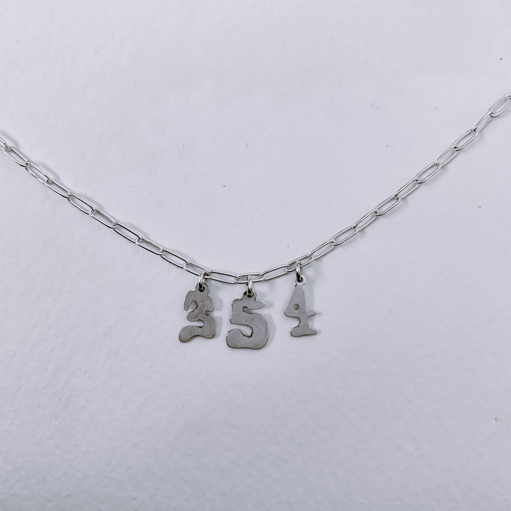 Necklace with three handcut silver number charms. Your choice of chain style and length.